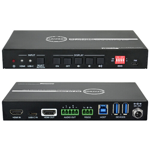 The unit also has two USB type-A data ports for devices such as cameras, microphones, or keyboards, and a USB type-B port for host connectivity. The 21E automatically switches to the first detected source device when set to Auto and to the lowest numbered input when the active source is removed. Stereo and multichannel audio are supported on the HDMI input, which gets embedded in the HDMI output stream while being simultaneously de-embedded to a balanced analog audio output.