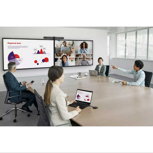Enjoy dual screen support, whereby content & people are shown side-by-side on 2 room displays. Hence, remote participants are always visible during video meetings. This ensures a more equitable experience for all meeting attendees, no matter if they join remotely or in-room. Benefit from interactivity features like local view of the room display, annotation, blackboarding and touch back support.