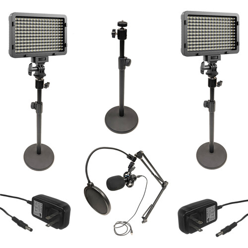 The 2-Light Stream Kit with Mic and StandsĀ was put together byĀ BescorĀ for when you need a lightweight and compact light source with power and mounting options. A great choice for portable on-camera lighting, this kit includes two light panels, each with a tabletop light stand, a power supply, and an NP-F battery charger for a separately purchased battery. The extra stand can be used to hold a reflector or the included USB-powered microphone.
