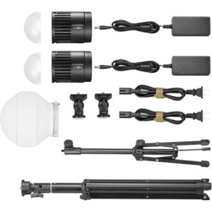 This Streaming KitĀ includes twoĀ BescorĀ Specter LED Lights, two tabletop light stands, and two AC adapters for the lights. The Specter lights feature an adjustable color temperature of 3200 to 5600K. The light stands offer 1/4″-20 and ball mounts and each have a three pound weighted base so they stay securely on your desk.