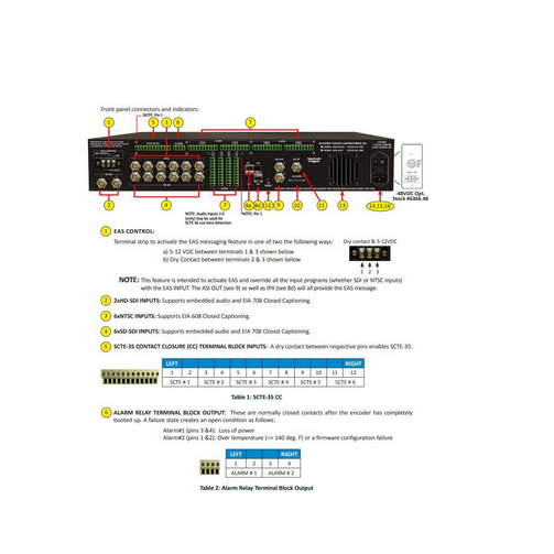 The Blonder Tongue HDE-2S-IP MPEG-2 HD/SD Encoder Multiplexer – 2xHD-SDI or 8xSD-SDI/NTSC to IP/2xASI accepts two (2) high definition (HD) programs from HD-SDI inputs or up to eight (8) standard definition (SD) programs across the SDI and/or NTSC inputs. MPEG-2 encoded outputs are multiplexed into one Multi Program Transport Stream (MPTS), which is available in the following formats simultaneously: 1xIP (100/1000 BaseT) and 2xASI. The encoder supports DolbyĀ® Digital audio encoding for (16) analog stereo audio pairs (L+R) which in addition to primary and secondary audio programs also provide a third pair for the Audio Descriptor Service, an additional narration track for blind and visually impaired, as mandated by the Twenty-First Century Communications and Video Accessibility Act of 2010 (CVAA). Ad insertion SCTE 35 compliant queuing messages are detected for each program from either the multiple audio Cue Tone inputs or an insertion contact closure (operator selectable). A baseband audio analog encoding capability table is provided in Section 2.3 (page 12) for easy reference. In addition to the baseband audio analog encoding capability audio programs that are already encoded and present on the SDI inputs may be multiplexed with the respective output (pass-through) without utilizing the baseband audio analog encoding resource. The encoder also supports Closed Captioning (EIA-608, and EIA-708), and Emergency Alert System (EAS). A front-panel DVI port is available for real-time monitoring of active programs during operation. Comprehensive remote monitoring and control is accomplished using any standard Web browser via a rear-panel SFP port (10/100BaseT).