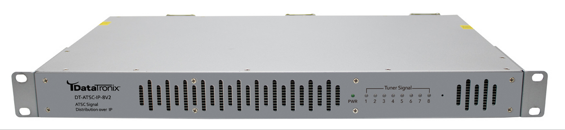 The DataTronix DT-ATSC-IP-8V2 allows the operator to create a custom IPTV distribution system output from ATSC off-air and/or QAM input sources. This unit accepts up to eight 8VSB over-the-air channels (including sub-channels), or clear QAM sources from a CATV feed, and outputs in IP. These outputs can be mapped to a desired unicast or multicast IP address.