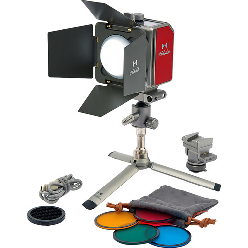 Included with the Mini are a set of barndoors with colored filters, a USB-C cable, and a power adapter. Giving you flexible mounting possibilities, this kit also includes a desktop tripod, a V-mount cold shoe adapter, and a V-mount ball head adapter. All packed into a classy, sturdy bag for convenient storage and transportation.