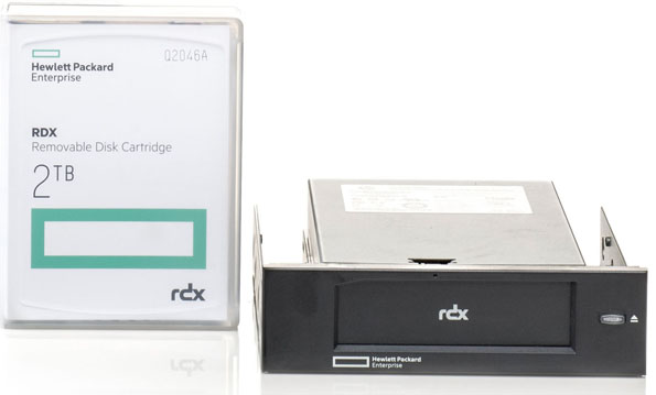 The HP RDX Removable Disk Backup System offers fast disk-based performance with the ability to store 2 TB of data on a single removable disk cartridge at speeds of up to 360GB/hr. Portable, durable and rugged removable disk cartridges simply and securely store your backups off site for complete data protection and peace of mind.
