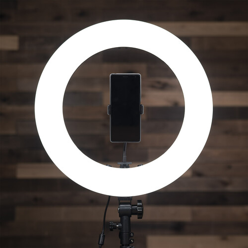 When you place the camera lens (or smartphone with the included mount and light stand) into the center of the 18″ ring, the Oryon’s signature characteristics emerge – soft light on the face, head, and shoulders. The circular catchlights reflected in your subject’s eyes also have a striking effect, especially up close. The Oryon is ready for worldwide use thanks to the inclusion of a multi-voltage AC adapter and batteries for situations where mains current is unavailable. A carry case is included for storage and transport.