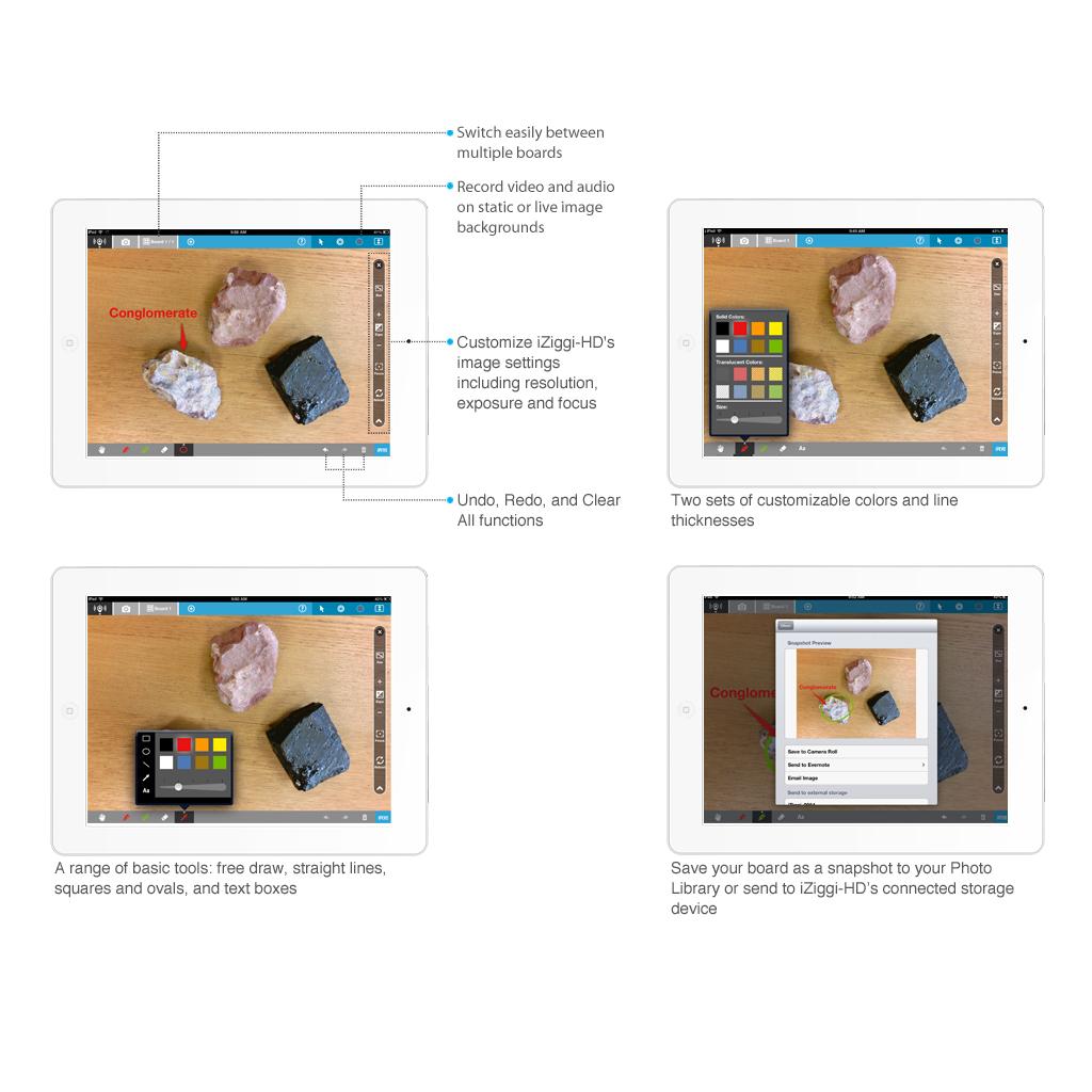 Designed with educators in mind, the free IPEVO Whiteboard app for iPad allows you to draw and add text directly onto iZiggi-HD’s real-time image stream. An easy-to-use touchscreen toolkit gives you the power to add emphasis, highlight important text passages, and add text boxes to clarify teaching material. In addition to live images, Whiteboard can also use blank whiteboards, iPad’s real-time camera image, or a Photo Library image. The IPEVO Whiteboard app can record iZiggi’s live video stream as well as voiceover/audio and any annotation you create. The video file is then saved to your iPad’s Photo Library. It’s easy, it’s integrated, and it’s the best way to demonstrate 3D objects which cannot be drawn or marked upon.