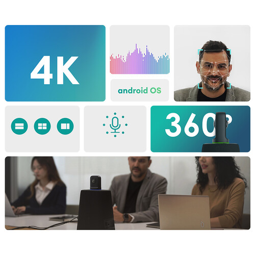 Video of team members are not only expertly and automatically framed, but also are enhanced by a variety of important capabilities boasted by the Meeting Ultra Standard. Images are captured and delivered at up to 4K resolution at 30 frames per second, while standard HD and Full HD video output settings are available. This is especially useful when one takes into consideration the built-in SD card slot, which enables onboard recording for playback of meetings in the future for reference or for personnel that were unable to attend. Before signals are delivered to their final destinations, the camera can reduce visual noise and provide enhanced contrast with HDR settings.One can hold off on purchasing any audio peripherals along with the Ultra Meeting Standard, as its built-in audio capture and output systems are capable of handling an entire room’s worth of chatter. It sports eight omnidirectional beamforming microphones, which help to isolate the audio coming from active participants; these microphones are actively assisted by ambient noise and echo reduction algorithms. Participants located up to 18′ from the device will be heard and the 10W built-in speaker ensures they can clearly hear collaborators on the other side of the call.