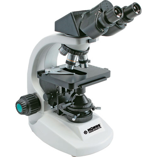 The Konus Biorex 2 Microscope with Infinity-Adjusted Objectives offers students and laboratory users a highly functional, well-constructed 1000x binocular microscope with the highest possible resolution and focusing range.  It has a 360° revolving binocular head set at a 45° angle to the base, with interpupillary adjustment as well.  The view can easily be shared amongst users very quickly, without losing focus or center point.  It is supplied with 10x eyepieces and a quartet of achromatic plan objectives (4x, 10x, 40x, and 100x) for 1000x maximum magnification.  These objectives are plan focus, meaning that they project an image which retains focus over a flat field that makes up 80-85% of the entire image area-you can simultaneously observe many details in sharp focus without having to manipulate the focus point.