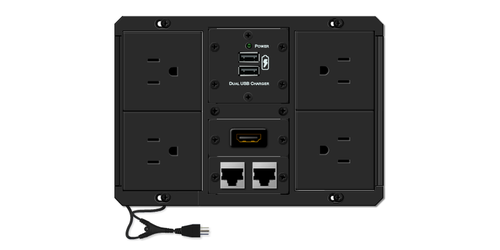 Includes: Ā 4 power with one 6′ cable, 1 HDMI, 2 CAT6, and 2 charging USB with power cable. Ā The USB ports are a stellar 2 amps each to charge any device. The HDMI and RJ45 connections are female to female so it is easy to install the cables on the backside.