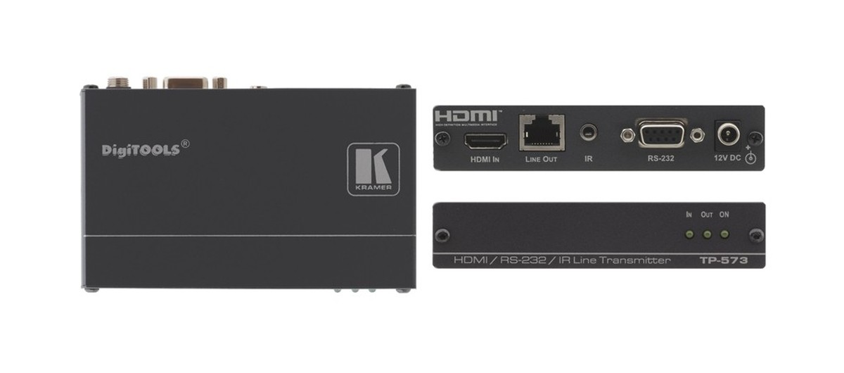 The Kramer TP-573 is a twisted pair transmitter for HDMI signals and sends bi-directional RS-232 and infrared signals over CAT cable (38400 max baud rate). The TP-573 converts an HDMI signal to a single twisted pair signal to your TP-574 receiver. You can send your HDMI signal via a 1080P signal up to 230′ using C-DGK6-DGK6 cable. When the TP-574 is within 150′ of the TP-573 the transmitter will power the receiver so the receiver doesn’t need power. The Kramer TP-573 has a max data rate of 4.95Gbps (1.65Gbps per graphic channel).