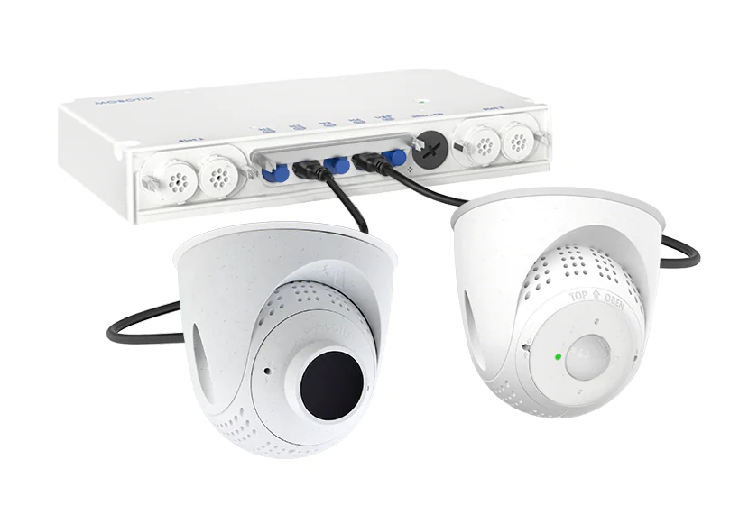 EN54 bundle S74A IP camera module (body) for connecting up to two additional functional and optical sensor modules (to be ordered individually) ONVIF-S/T-compliant MOBOTIX 7 system platform with H.264/H.265 (Triple Streaming), MxPEG+ and M-JPEG CIF Thermal sensor (336×256 Pixel), with Thermal Radiometry, 25° x 19° Image sensor options (via sensor module): 4K (8 megapixels), color (day) and/or B/W (night) and/or color (day/night with IR cut) Lens options (via sensor module): horizontal image angle from 95° to 15° Max. image size (per image sensor): 4K UHD (3840 x 2160 pixels), 16:9 WDR: up to 120 dB Functional extensions (via optional MOBOTIX modules): IR Light (supports 15°, 45°, 95° lenses), USB-C Operating conditions: IP66/IK010 (housing), -40 to 65°C (-40 to 149 °F) Internal DVR: 8 GB microSD (for MxPEG+ recordings) Max. Power consumption: 25 W, supply via network cable, PoE Class 4 (IEEE 802.3af/at) Connections: 1x RJ45 jack for weatherproof network connection via MOBOTIX patch cable (Ethernet 1000BaseT), 2x MOBOTIX module connection (1x optical/1x functional), USB-C, further connections via interface board Software interface for MOBOTIX Certified Apps (based on Deep Learning, approx. 20 different 30-day demo versions pre-installed) Housing: Aluminium, PBT-30GF Color: white Warranty: 3 years (optionally extendable up to 8 years) Bundle content: Mx-S74A, Mx-F-S7A-RJ45-VDC, Mx-O-M7SB-336RP150, Mx-F-MSA, Mx-M-PTMA, 2xMx-A-S7A-CBL03-AN