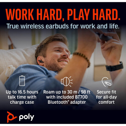 These earbuds offer multipoint support for connecting up to two devices at once, such as your smartphone and laptop. The supplied USB-A dongle plugs directly into a compatible computer or mobile device to ensure wireless connectivity for older devices. The wireless Qi charge-compatible charging case features a common USB-C connection for 3 hours of charging, or a 15-minute fast charge for 1.2 hours of talk, and also includes a 3.5mm audio input, so you can enjoy content, like inflight entertainment, with wireless convenience. The Voyager Free 60+ UC includes three pairs of silicone eartips (small, medium, large), a USB-C to USB-A charging cable, a BT700 USB-A Bluetooth adapter, and a USB-C to 3.5mm audio cable.