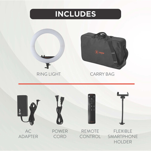 Easily adjust the color temperature and brightness of the Raya FRB-NPF-18 ring light using the onboard analogue controls and digital display, or with the included wireless remote control.