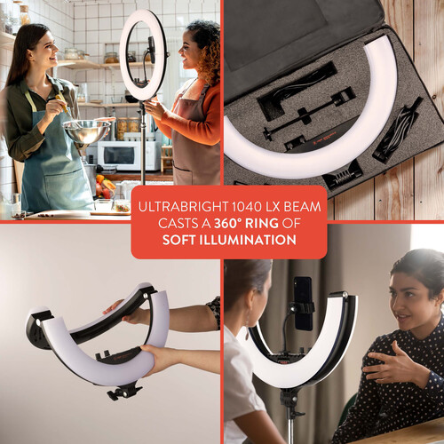 TheĀ Bendie-Brite Folding Bi-Color LED Ring LightĀ fromĀ RayaĀ measuresĀ 18″ in diameter and produces soft light useful for illuminating your vlog, selfie, video conference, or webcam chat. It has a unique feature great for anyone on the go – it folds in half to an 11″ semi-circle for compact storage or transport. The ring light minimizes shadows, produces an even quality of light, and creates circular catchlights in your subject’s eyes.
