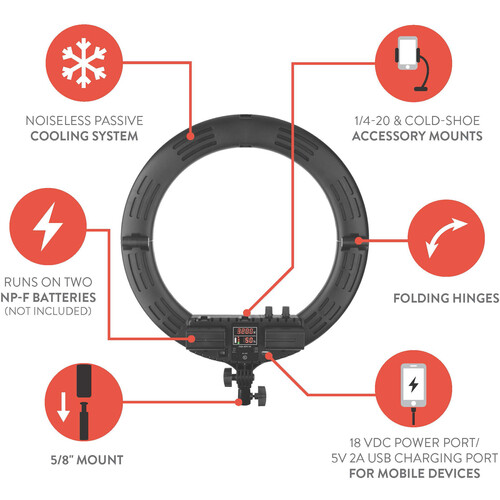 This ring light can be powered by the included multi-voltage AC power supply or with two separately-available NP-F-type batteries