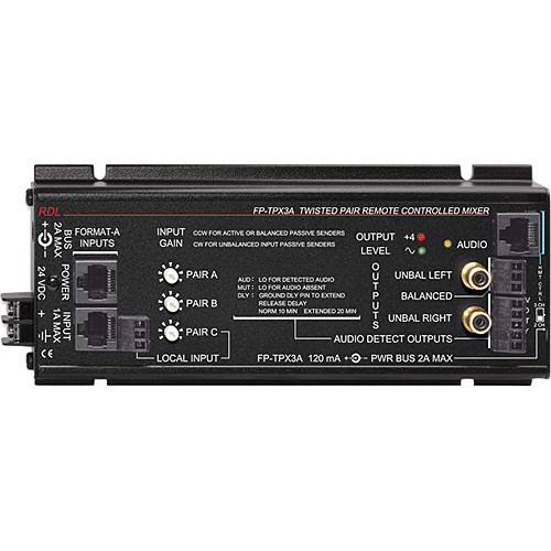 TheĀ RDL FP-TPX3A Format-A Twisted Pair Remote Controlled MixerĀ is a 3-channel audio mixer used for controlling multiple sound sources within zones in commercial PA and paging audio systems. The FP-TPX3A features 3 inputs that may be used as balanced or unbalanced, microphone or line level connections, and phantom power is sent to microphones and sources that require it. Connections are made over Format-A twisted pair inputs, and a pair of unbalanced RCA outputs are also featured. The Audio Detect Outputs feature an LED that detects output signal, as well as trigger outputs that automatically start/shut down compatible audio gear, in order to maximize energy efficiency and preserve the life span of the connected audio sources.