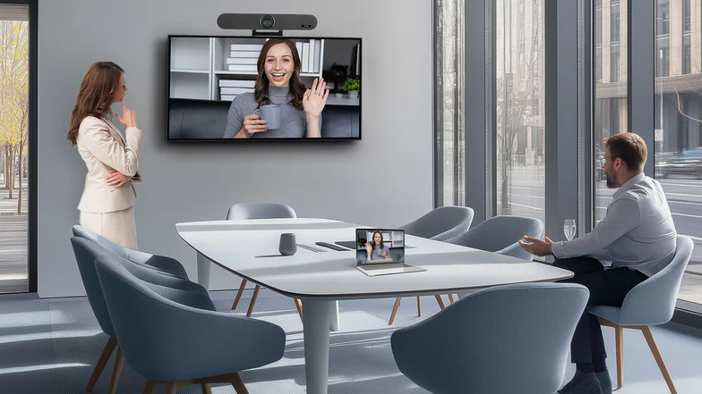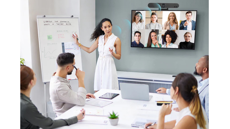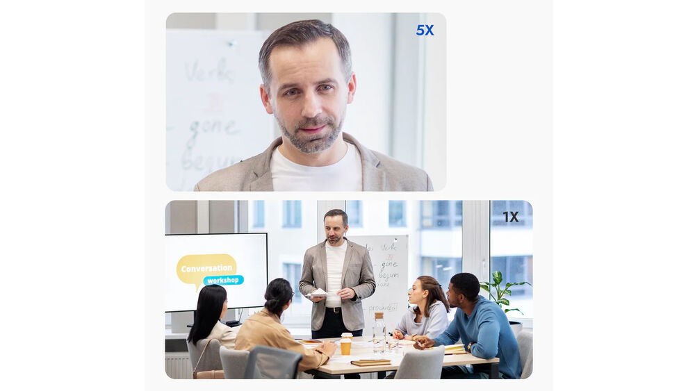 An auto-framing feature automatically adjusts the camera to cover all participants, keeping everyone in view.