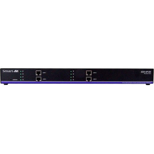 TheĀ SDX-4P-RX Quad DVI-D, Dual RS-232, Audio, and USB Keyboard and Mouse ReceiverĀ fromĀ Smart-AVIĀ uses HDBaseT technology to receive quad DVI-D signals up to 400′ over four CAT5/5e/6 cables. It also extends USB keyboard and mouse, audio, and RS-232 signals, giving users the ability to control displays or devices remotely.