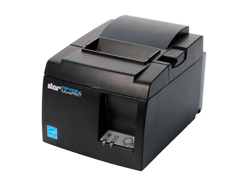 The detailed front view highlights the TSP100III’s professional-grade construction and clear branding elements. The high-contrast image emphasizes the printer’s robust build quality and premium finish. The easily accessible control panel and paper handling system demonstrate the printer’s focus on operational efficiency and user convenience.