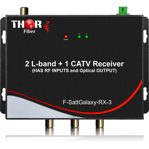 Thor Optical MDU Satellite Receiver F-SattGalaxy-RX converts the optical signal back to the original 2 satellite signals and the third terrestrial off-air TV signal injected on the TX.