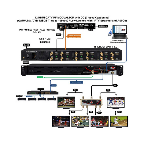 The high capacity H-12HDMI-ATSC-IPLL Encoder Modulator from Thor Broadcast has a sophisticated redesigned platform for enabling modulation of up to 12 HDMI sources and 12 CVBS CC(Closed Caption) sources simultaneously. This unit has the ability to ingest IP Transport Streams and multiplex them among the RF output channels, similarly you can also input a single ATSC(or other RF modulation standard) and add its transport streams among the QAM output. This unit comes standard with a plethora of options to help you add extra transport streams from various media to build your own RF headend quickly and easily without extra hardware. The H-12HDMI-QAM-IPLL supports MPEG2 and MPEG-4 AVC/H.264 video encoding and MPEG1 Layer II audio encoding (MPEG-2 AAC, MPEG-4 AAC Optional), Dolby Digital AC3, as well as AC3 pass through. This unit has the ability to multiplex, create, and add program streams to your RF QAM cable channels cost-effective design make this device widely used in variety of digital distribution systems such as CATV headend cable systems, creating your own digital signage systems, and adding HDMI sources to your existing QAM cable system in a single 1RU high density encoder modulator from Thor.