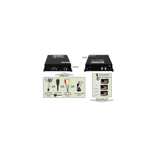 CMOD compact encoder modulator system with licensed Dolby AC/3 audio codec & digital HDTV QAM output. Ideal for video distribution in existing systems or buildings wired with coax for cable TV. Converts live video to a digital HDTV channel compatible with any QAM set top box, tuner, or digital TV. Inputs are provided for HDMI or Component video up to 1080p60 for H.264 or 1080i60 for MPEG-2. Provides same quality encoding as larger 19in rack systems without the advanced features seldom needed in most installations; such as ASI or IP interfaces. USB file storage interface is provided for recording the encoded video transport stream from live sources. These *.ts files can then be transferred to a computer or played back through the modulator output on loop. This feature is ideally suited for digital signage applications or for system information channels. All features are available through the front panel LCD & back lit keypad for convenient programming. This unit can generate digital TV channels compatible with most USA cable systems or DVB-C receivers.