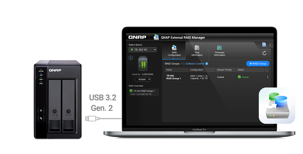 Compared with other RAID enclosures, the TR-002 provides software-controlled configurations for greater management flexibility. Users can configure RAID and monitor disk health using Storage & Snapshots Manager on a QNAP NAS, or by using the QNAP External RAID Manager utility on their computer.