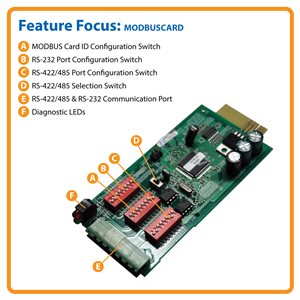 Tripp Lite’s MODBUSCARD provides UPS systems with the functionality of communication with PCs via MODBUS. Implements MODBUS RTU protocol. Provides MODBUS functions including Read Coils, Discrete Inputs, Holding Registers, Input Registers, Write Single Coil and Single Register. Provides RS-422/485 and RS-232 interfaces (PC communicates with UPS via RS-422/485 or RS-232 or both at the same time). Three sets of 8 dipswitches support Card ID, RS-232 and RS-422/485 configurations. Includes RS-422/485 and RS-232 communications ports. See manual for detailed setup instructions and full set of functions and configuration options. Compatible with select SmartOnline UPS models only (The MODBUSCARD should be listed within the “UPS Accessories” or “Power Management & Hardware” sections of the compatible UPS product webpage).