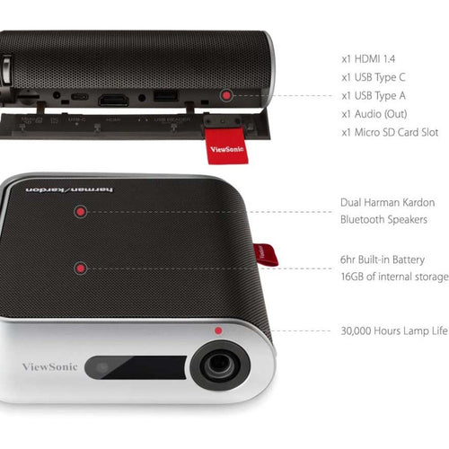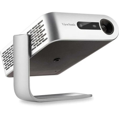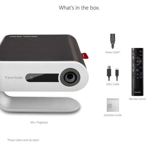 The ViewSonicĀ® M1+ is an ultra-portable WVGA LED projector that delivers convenient entertainment in nearly any room. With a built-in battery and over 30,000 hours of operational life, this projector will deliver years of multimedia entertainment wherever it goes. Weighing less than two pounds, the M1+’s compact and lightweight design makes it ideal for moving from room to room, or for indoor/outdoor usage. An integrated smart stand provides for simple 360-degree setup, while also doubling as a lens cover. Once the lens is uncovered, the projector automatically powers on with full brightness for instant entertainment. The lens also includes a safety auto-off feature that powers down the projector when objects are detected too close to the lens. Dual Harman Kardon Bluetooth speakers provide crisp and clear sound for multimedia content, while a short throw lens can display large images in small spaces. Versatile connectivity options include a MicroSD card slot, USB Type-A and USB Type-C. What’s more, integrated smart Wi-Fi connectivity lets you stream and binge from your favorite content providers like YouTube – making the M1+ a great option for sharing and displaying videos and other multimedia content.